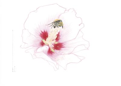 lise duclaux, un bourdon des champs plongeant dans une mauve en arbre, 2025, crayon et peinture sur papier © Courtesy de l’artiste et Annie Gentils gallery